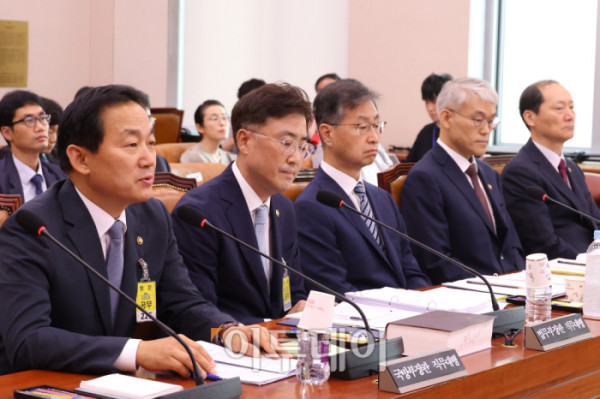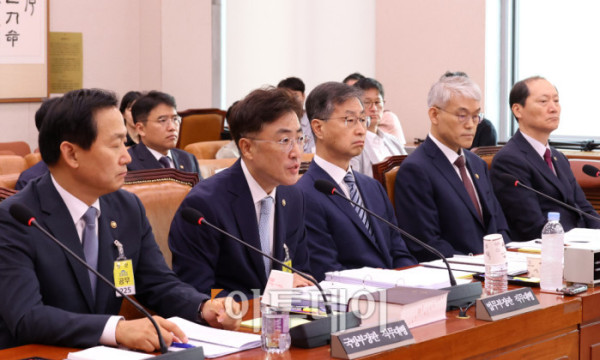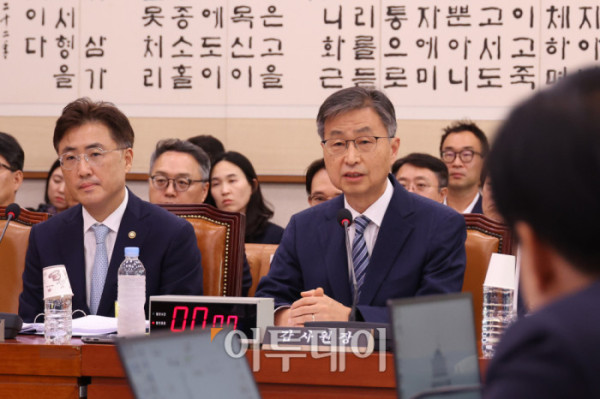 ▲이진수 법무부 장관 직무대행이 1일 서울 여의도 국회에서 열린 법제사법위원회 전체회의에서 의원 질의에 답하고 있다. 왼쪽부터 이두희 국방부 장관 직무대행, 이 직무대행, 최재해 감사원장, 천대엽 법원행정처장, 이완규 법제처장. 고이란 기자 photoeran@