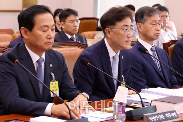 ▲이진수 법무부 장관 직무대행이 1일 서울 여의도 국회에서 열린 법제사법위원회 전체회의에서 의원 질의에 답하고 있다. 왼쪽부터 이두희 국방부 장관 직무대행, 이 직무대행, 최재해 감사원장. 고이란 기자 photoeran@