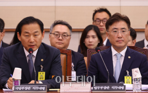 ▲이두희 국방부 장관 직무대행이 1일 서울 여의도 국회에서 열린 법제사법위원회 전체회의에서 의원 질의에 답하고 있다. 오른쪽은 이진수 법무부 장관 직무대행. 고이란 기자 photoeran@