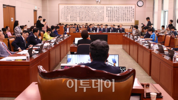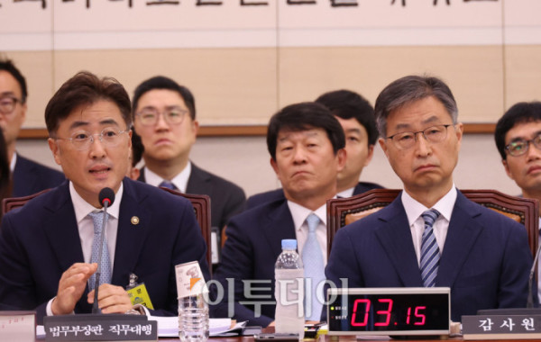 ▲이진수 법무부 장관 직무대행이 1일 서울 여의도 국회에서 열린 법제사법위원회 전체회의에서 의원 질의에 답하고 있다. 오른쪽은 최재해 감사원장. 고이란 기자 photoeran@