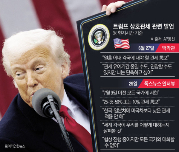 트럼프 행정부는 한국과 일본을 포함한 57개 경제주체(56개국+유럽연합)에 차등화된 상호관세를 지난 4월 9일 발효했다가 13시간 만에 90일간 유예(중국 제외)했다. 이 유예 기간이 오는 8일 끝난다. 이때까지 최종 합의가 이뤄지지 않으면 이튿날(7월 9일)부터 각국에 해당 관세를 부과한다는 계획이다.
