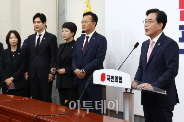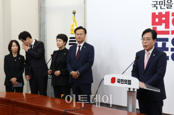 ▲송언석 국민의힘 비상대책위원장 겸 원내대표가 2일 서울 여의도 국회에서 비대위원장 취임 기자회견을 하고 있다. 왼쪽부터 최수진, 박성훈 원내대변인, 김은혜 원내정책수석, 유상범 원내운영수석부대표.