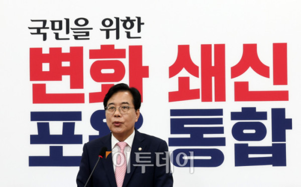 ▲송언석 국민의힘 비상대책위원장 겸 원내대표가 2일 서울 여의도 국회에서 비대위원장 취임 기자회견을 하고 있다. 고이란 기자 photoeran@