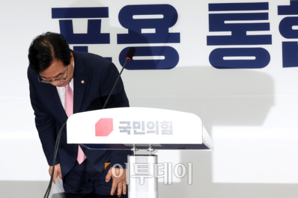 ▲송언석 국민의힘 비상대책위원장 겸 원내대표가 2일 서울 여의도 국회에서 비대위원장 취임 기자회견을 마치고 인사하고 있다. 고이란 기자 photoeran@