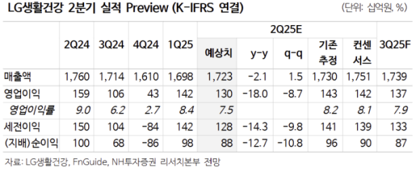 LG생활건강의 2분기 매출액은 전년 대비 2% 감소한 1조7234억 원, 영업이익은 18% 감소한 1300억 원으로 컨센서스를 밑돌 것으로 예상됐다.