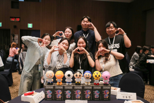 ▲'아이케어 업(i-CARE UP)' 행사에 참여한 아동보호전문기관 종사자들이 자신의 목표를 적어 만든 피규어와 기념 촬영을 하는 모습. (사진=현대차)