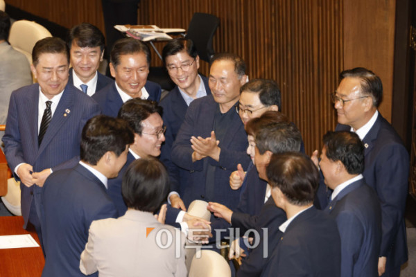▲김민석 국무총리 후보자가 3일 서울 여의도 국회 본회의에서 본인의 임명동의안이 가결되자 동료 의원들에게 축하를 받고 있다. 고이란 기자 photoeran@