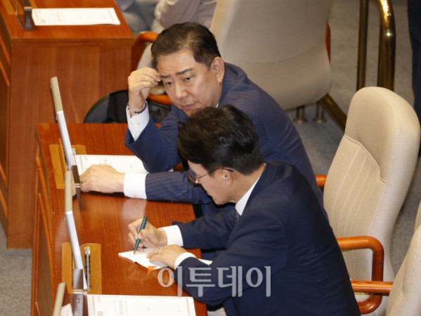 ▲김병기(왼쪽) 더불어민주당 대표 직무대행 겸 원내대표와 김민석 국무총리 후보자가 3일 서울 여의도 국회 본회의에서 대화하고 있다. 고이란 기자 photoeran@