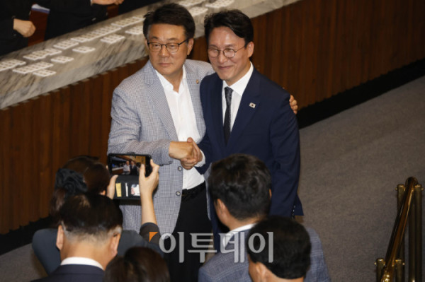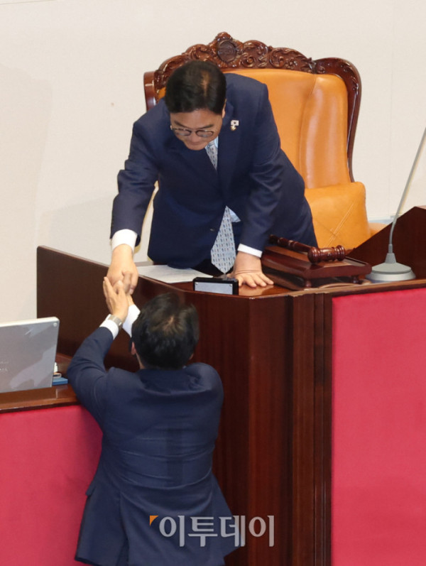 ▲김민석 국무총리 후보자가 3일 서울 여의도 국회 본회의에서 본인의 임명동의안에 대한 투표를 마치고 우원식 국회의장과 인사하고 있다. 고이란 기자 photoeran@