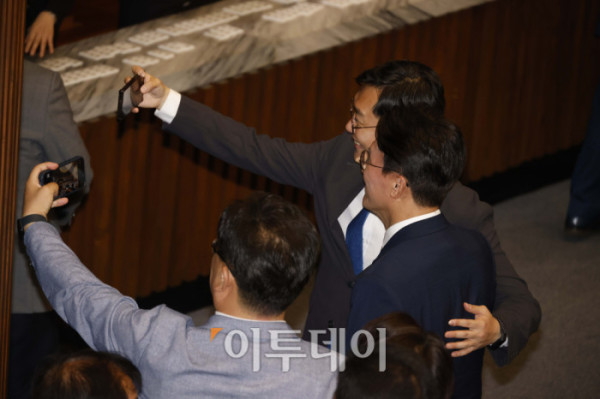 ▲김민석(오른쪽) 국무총리 후보자가 3일 서울 여의도 국회 본회의에서 본인의 임명동의안에 대한 투표에 앞서 동료 의원들과 기념촬영을 하고 있다. 고이란 기자 photoeran@