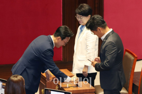 ▲김민석 국무총리 후보자가 3일 서울 여의도 국회 본회의에서 본인의 임명동의안에 대한 투표를 하고 있다. 고이란 기자 photoeran@