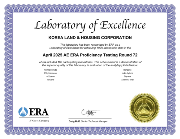 한국토지주택공사(LH)는 LH품질시험인정센터가 미국 환경자원학회(ERA)로부터 국제숙련도 시험평가 결과 6년 연속 ‘최우수 기관’으로 선정됐다고 4일 밝혔다.
