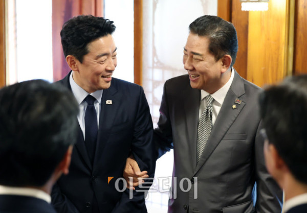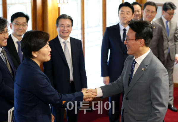 ▲김민석(오른쪽) 국무총리와 송미령 농림축산식품부장관이 6일 서울 종로구 국무총리 공관에서 열린 이재명 정부 첫 고위당정협의회에서 인사를 하고 있다. 조현호 기자 hyunho@
