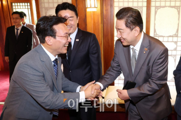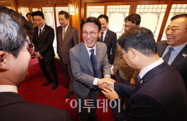 ▲김민석 국무총리가 6일 서울 종로구 국무총리 공관에서 열린 이재명 정부 첫 고위당정협의회에서 참석자들과 인사를 하고 있다. 조현호 기자 hyunho@