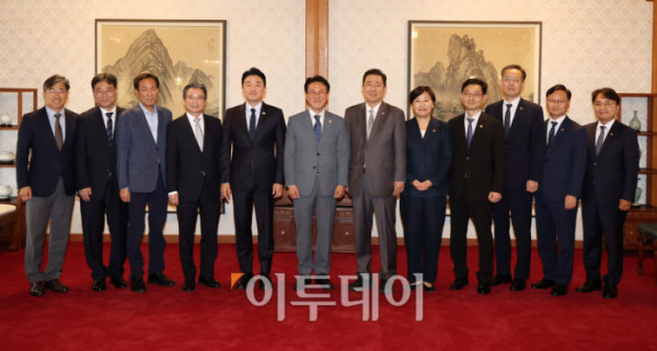 ▲김민석(오른쪽 일곱 번째) 국무총리와 김병기(오른쪽 여섯 번째) 더불어민주당 대표 직무대행 겸 원내대표, 강훈식 대통령 비서실장 등 참석자들이 6일 오후 서울 종로구 삼청동 국무총리 공관에서 열린 이재명 정부 첫 고위당정협의회에서 기념촬영을 하고 있다. 조현호 기자 hyunho@