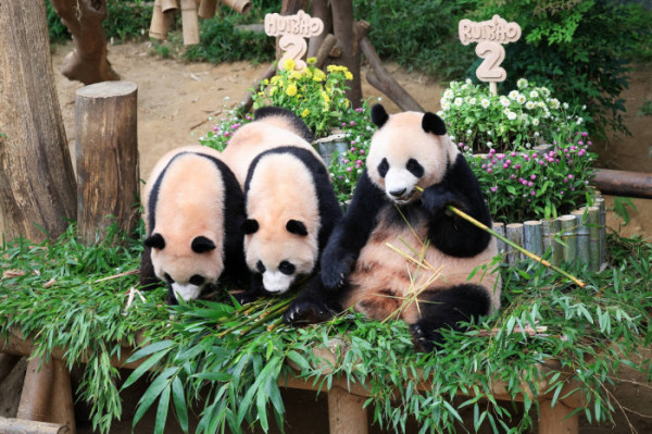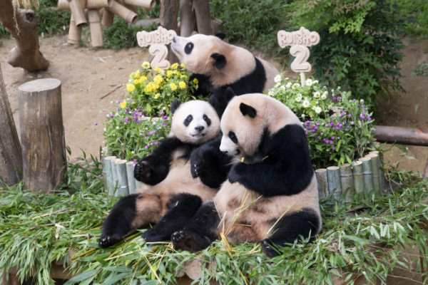 ▲7일 두돌 생일을 맞은 에버랜드 쌍둥이 판다 루이바오(왼쪽), 후이바오(가운데), 엄마 판다 아이바오(오른쪽) (사진제공=삼성물산 리조트부문)