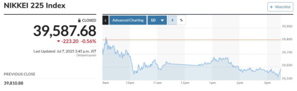 일본증시 닛케이225지수(닛케이)는 전날보다 223.20포인트(0.56%) 하락한 3만9587.68에 마감했다. 기술주 중심의 토픽스도 전날 대비 16.23포인트(0.57%) 내리며 2811.72에 마감했다.
