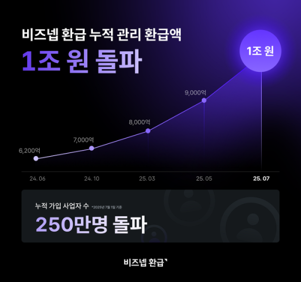 비즈넵의 성장세는 시간이 지날수록 더욱 가팔라지고 있다. 누적 환급액은 2024년 10월 7,000억 원을 돌파한 후, 8,000억 원(2025년 2월)까지 4개월, 9,000억 원(2025년 5월)까지 3개월이 걸렸다. 그리고 9,000억 원에서 1조 원 돌파까지는 불과 2개월이 소요돼, 1천억 원을 추가 달성하는 기간이 급격히 단축되는 폭발적인 성장세를 증명했다.