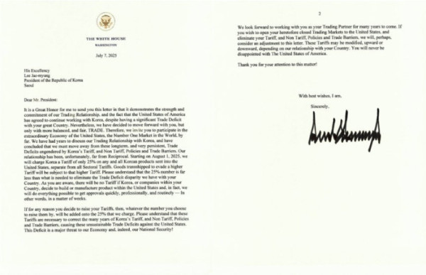 트럼프 대통령은 이날 사회관계망서비스(SNS) 트루스소셜에 공개한 서한에서 "우리의 관계는 유감스럽게도 상호주의와 거리가 멀었다"면서 "2025년 8월 1일부터 우리는 미국으로 보낸 모든 한국산 제품에 겨우 25%의 관세를 부과할 것이며 이 관세는 모든 품목별 관세와 별도"라고 밝혔다.