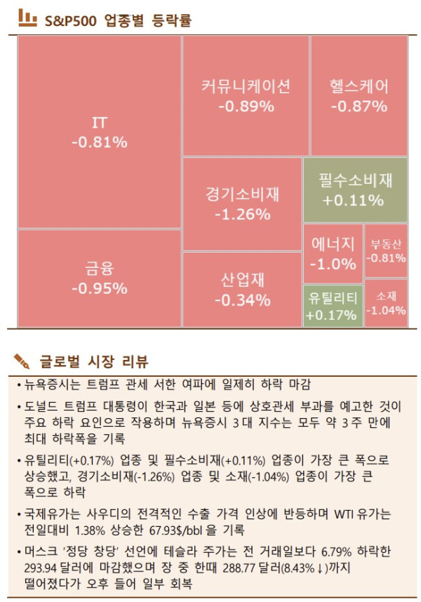 [글로벌 증시 요약] 美 뉴욕 증시, 트럼프 관세 서한 여파에 일제히 하락 마감