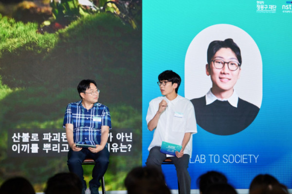 ▲2025 그린 소사이어티 공개강연 시리즈 패널토의 모습. (왼쪽부터) 황동수 ㈜블루카본 대표, 박재홍 ㈜코드오브네이처 대표. (사진=현대차정몽구재단)