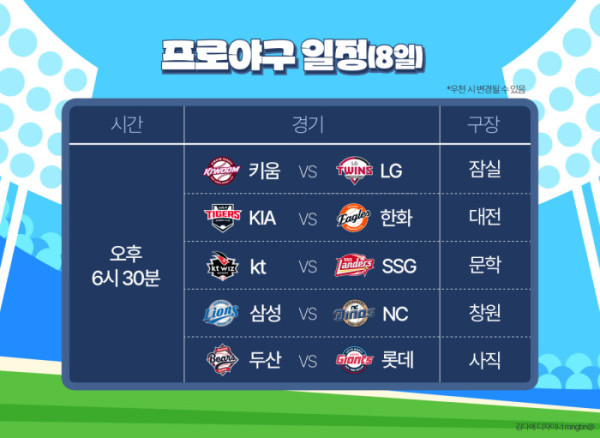 한편 롯데는 홍민기를 선발로 낙점했다. 두산은 최민석을 내보낸다. kt 위즈와 SSG 랜더스는 배제성과 김광현을 각각 선발로 예고했다.