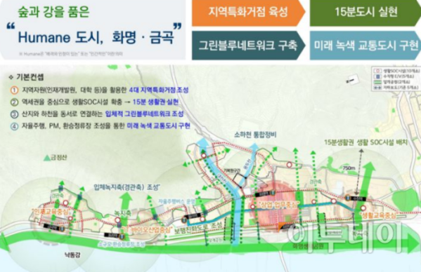 화명·금곡지구는 ‘숲과 강을 품은 휴메인 도시’를 비전으로 제시하며, 평균용적률을 현재 234%에서 최대 350%까지 상향 조정하는 방안을 담았다. 지역 특화거점 조성과 ‘15분 도시’ 실현 등을 통해 공공성과 생활밀착형 인프라 강화가 주요 방향이다.
