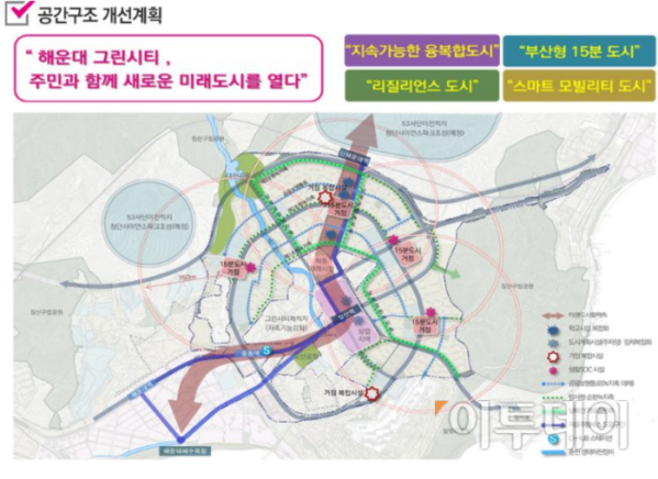 해운대지구는 ‘해운대 그린시티, 주민과 함께 새로운 미래도시를 열다’를 비전으로, 평균용적률을 250%에서 최대 360%로 높이고 지속가능한 융복합 도시, 스마트 모빌리티 도시 등으로의 공간 재구조화를 계획했다.