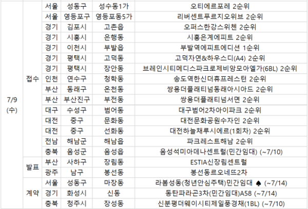 이날 부산 사하구 'ESTIA신장림센트럴'과 광주 남구 '봉선동르오네뜨2차'의 당첨자 발표도 이뤄진다.