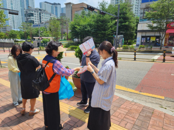 ▲광교1동과 지역사회보장협의체 위원들이 8일 광교1동 행정복지센터 앞에서 복지사각지대 발굴과 긴급지원 제도 홍보 캠페인에 참여하고 있다. (수원시 영통구 광교1동)