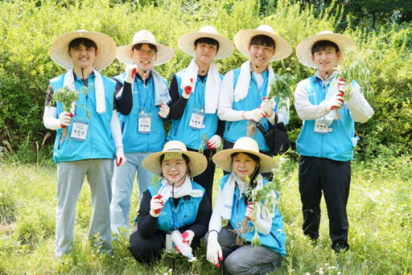 ▲에코프로 직원들이 속리산국립공원에서 8일 외래식물 제거 봉사 활동에 참여하고 있다. (에코프로)