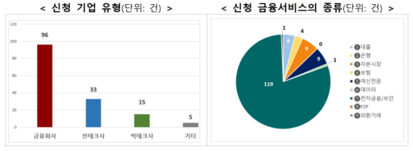 신청 금융서비스의 종류는 전자금융·보안이 119건(79.9%)으로 가장 많았고, 자본시장과 여신전문 분야가 각각 9건(각 6.0%)으로 뒤를 이었다. 이외에도 △대출 (6건, 4.0%) △은행 (4건, 2.7%) △데이터 및 외환거래 분야 (각 1건, 0.7%) 접수됐다.