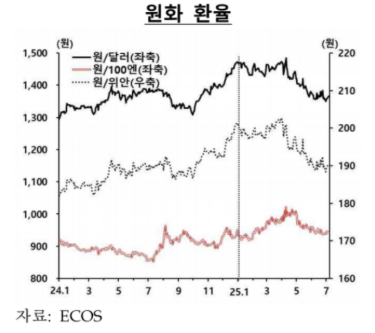 다만 7월 들어 미 행정부의 대중국 상호관세 유예 종료 가능성이 제기되면서 원화 강세 흐름은 다소 둔화된 상태다. 7월 7일 기준 환율은 1367.8원으로 6월 말 대비 17.8원 상승했다.