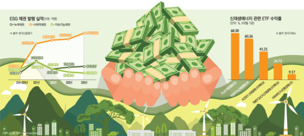 2018년부터 지난해까지 발행한 ESG 채권 조달자금(약 199조 원) 중 환경 프로젝트에 45조4000억 원이 배분됐다. ‘친환경 교통수단’에 20조8000억 원(10.4%)으로 가장 많은 자금이 쓰였으나, ‘신재생에너지’에도 8조4000억 원(4.2%)이 배분됐다. 이재명 대통령이 신재생에너지를 강조하는 만큼 이를 사용 목적으로 한 ESG 채권 발행이 늘어날 것으로 기대된다.