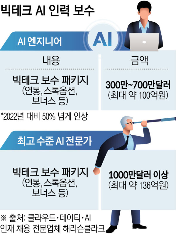 이러한 수요에 실제로 AI 업계의 급여 수준은 전반적으로 꾸준히 상승하고 있다. 클라우드·데이터·AI 인재 채용 전문업체 해리슨클라크에 따르면 AI 엔지니어의 일반적인 빅테크 보수 패키지 즉 연봉과 스톡옵션, 보너스 등을 포함한 보수 수준은 300만∼700만 달러(최대 약 100억 원)로 2022년 대비 50%나 올랐다. 최고 수준 AI 전문가의 보수는 1000만 달러(약 136억 원)도 넘는다.