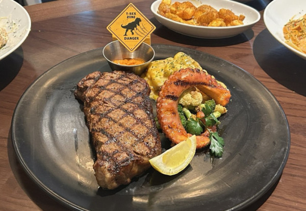 컬래버 핵심은 메뉴다. △블랙라벨 스테이크 쥬라기월드 에디션 △멜팅 다이노 쇼콜라 아이스크림 △쥬라기 바이트 아란치니 등 쥬라기월드에서 영감받은 것들이다. 블랙라벨 스테이크는 영화의 핵심 콘셉트 ‘육해공’을 접시 하나에 재현했다. 블랙라벨 스테이크(육류)를 중심으로 문어(해산물), 치즈·버섯을 곁들인 닭요리(가금류)를 함께 구성했다.