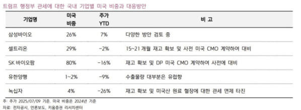 그는 "국내업체들 역시 연초부터 관세 대응 방안으로 재고 비축과 미국 CMO 계약 등을 마련해왔다"며 "미국내에 생산시설이 없는 CDMO 업체들의 경우 공급망 재검토가 필요할 것으로 보인다"고 짚었다.
