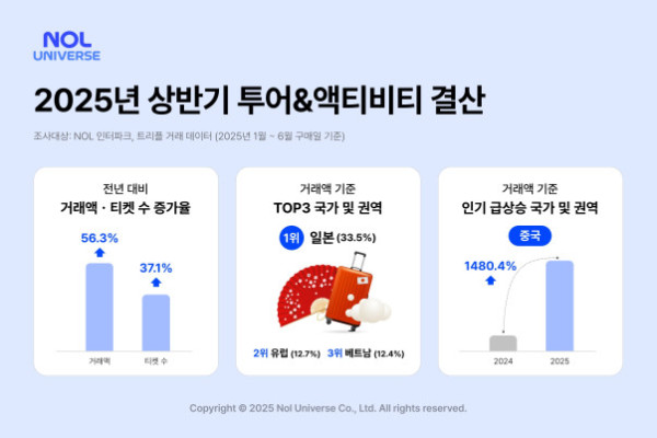 놀유니버스는 2025년 상반기 놀유니버스의 투어&액티비티 카테고리 판매 데이터를 분석한 결과, 거래액이 전년 동기 대비 56.3% 신장했다고 10일 밝혔다. 판매 티켓 수 역시 37.1% 늘어나며 증가하는 해외여행 수요에 대응한 결과를 보였다는 설명이다. 국가 및 권역별 거래액 비중은 일본, 유럽, 베트남 순이었다.