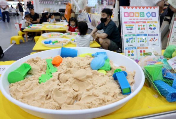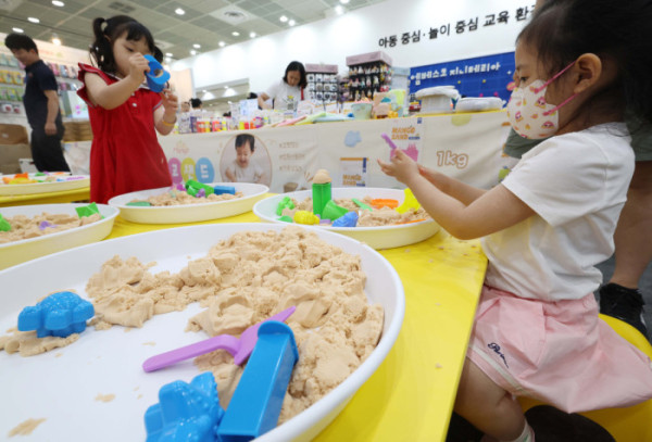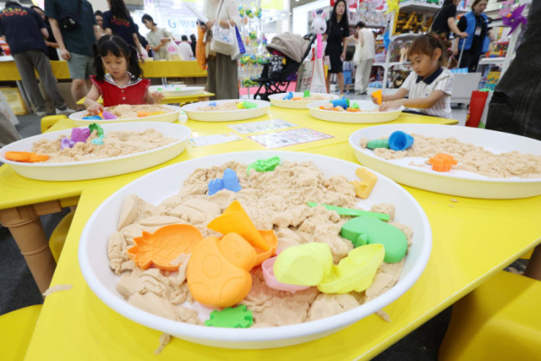 ▲10일 서울 강남구 코엑스에서 열린 제55회 서울국제유아교육전·키즈페어에서 유아들이 손에 묻지않는 모래놀이를 하고 있다. 서울국제유아교육전은 국내 최대 규모의 유아 전문 전시회로, 유아동 관련 교육, 용품, 서비스, 생활, 문화를 소개하는 자리다. 신태현 기자 holjjak@