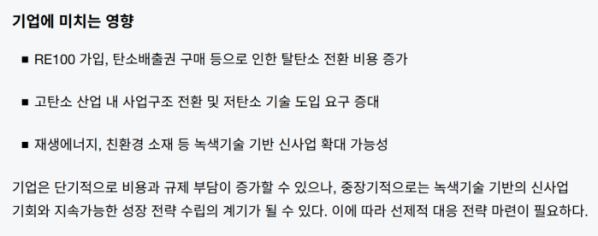 보고서는 환경 부문에서는 저탄소 경제로의 전환과 친환경 산업 육성을 중심으로 정책이 설계되고 있으며, 이러한 변화는 단기적으로 재생에너지 전환 및 저탄소 기술 도입에 따른 투자 부담을 키우고, 고탄소 산업 중심의 사업구조 전환 압박 등으로 기업의 비용 부담을 높일 것으로 전망된다. 하지만 중장기적으로는 녹색기술 기반의 신사업 기회 확대, 투자 활성화 등을 통해 지속가능한 성장과 글로벌 경쟁력 확보의 기회로 작용할 수 있을 것으로 보인다.