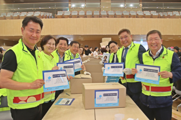 ▲김석회(왼쪽서 첫 번째) 광진복지재단 이사장, 신혜영(왼쪽서 두 번째) 서울 사랑의열매 사무처장, 김재록(오른쪽서 두 번째) 서울 사랑의열매 회장, 김경호(오른쪽서 첫 번째) 광진구청장 등 관계자들이 혹서기 대응을 위한 '여름나기 물품키트'를 제작한 뒤 기념촬영을 하고 있다. (사진제공=사회복지공동모금회)