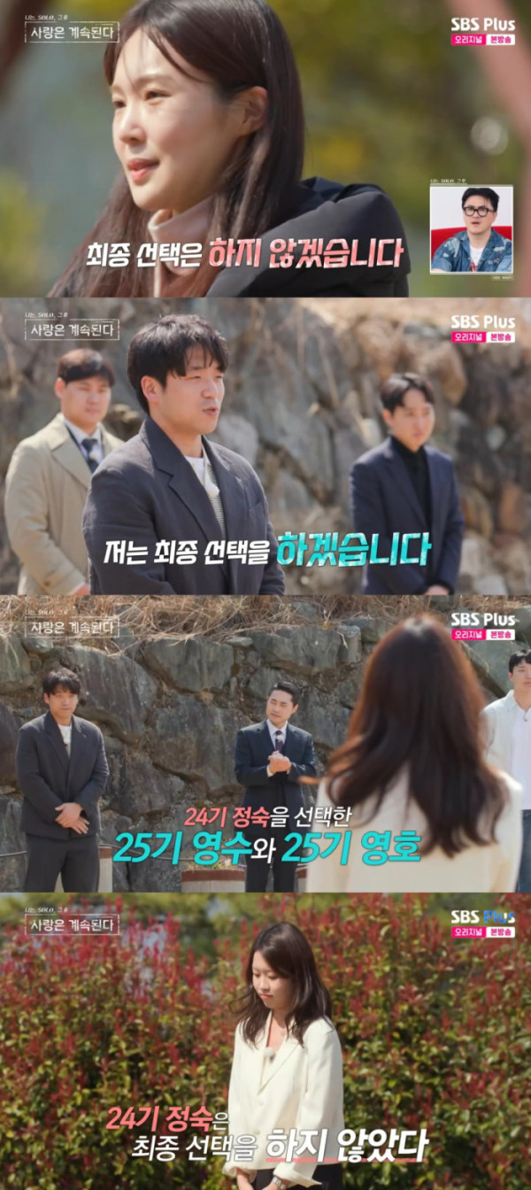 이어 23기 영호, 24기 영수 역시 “좋은 시간이었지만 반려를 찾지는 못한 것 같다”라며 최종 선택을 포기했다. 23기 영호에 호감을 느꼈지만 장거리 문제에 부딪혔던 21기 옥순도 결국엔 최종선택을 하지 않았다.