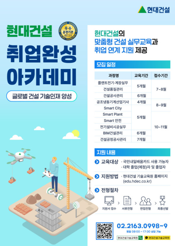 현대건설 기술교육원은 건설산업 분야의 글로벌 기술인재 양성을 위해 '취업완성 아카데미' 기술교육생을 모집 중이라고 11일 밝혔다.