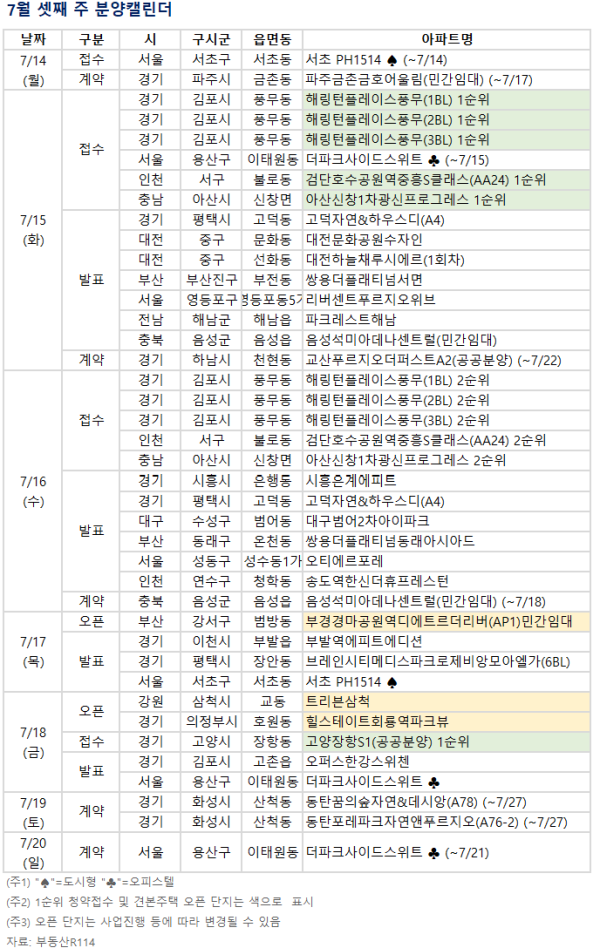 부동산 정보업체 부동산R114에 따르면 7월 셋째 주에는 전국 6개 단지 총 4098가구(일반분양 3192가구)가 분양을 실시한다. 경기 김포시 풍무동 ‘해링턴플레이스풍무(1·2·3블록)’와 인천 서구 불로동 ‘검단호수공원역중흥S클래스(AA24)’ 등은 15일에, 경기 고양시 장항동 ‘고양장항S1(공공분양)’은 18일 청약을 진행한다.