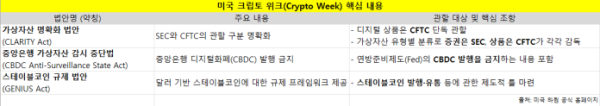 미 하원은 크립토 위크 기간 △가상자산 명확화 법안(CLARITY Act) △중앙은행 가상자산 감시 중단법(CBDC Anti-Surveillance State Act) △스테이블코인 규제 법안(GENIUS Act) 등 총 3개의 핵심 법안을 본회의에 상정할 계획이다.