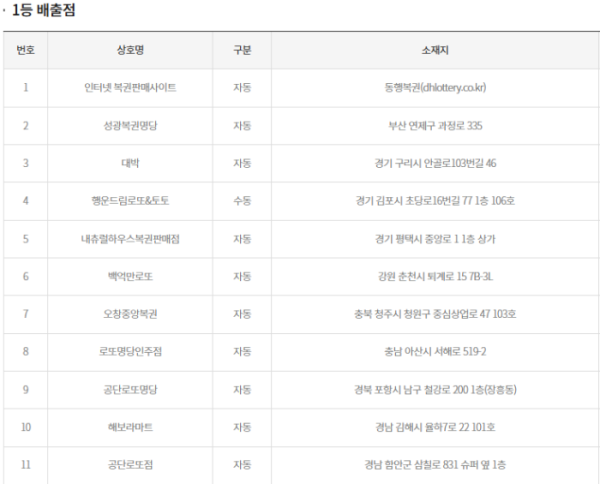 로또 1등 당첨자를 배출한 곳은 경기 구리시 안골로 '대박', 경기 김포시 초당로 '행운드림로또&토토', 경기 평택시 중앙로 ‘내츄럴하우스복권판매점’, 경남 김해시 율하7로 ‘해보라마트’, 경남 함안군 삼칠로 ‘공단로또점’, 부산 연제구 과정로 ‘성광복권명당’, 강원 춘천시 퇴계로 ‘백억만로또’, 충북 청주시 청원구 중심상업로 ‘오창중앙복권’, 충남 아산시 서해로 ‘로또명당인주점’, 경북 포항시 남구 철강로 ‘공단로또명당’, 인터넷 복권판매사이트 ‘동행복권’ 등 11곳이다.