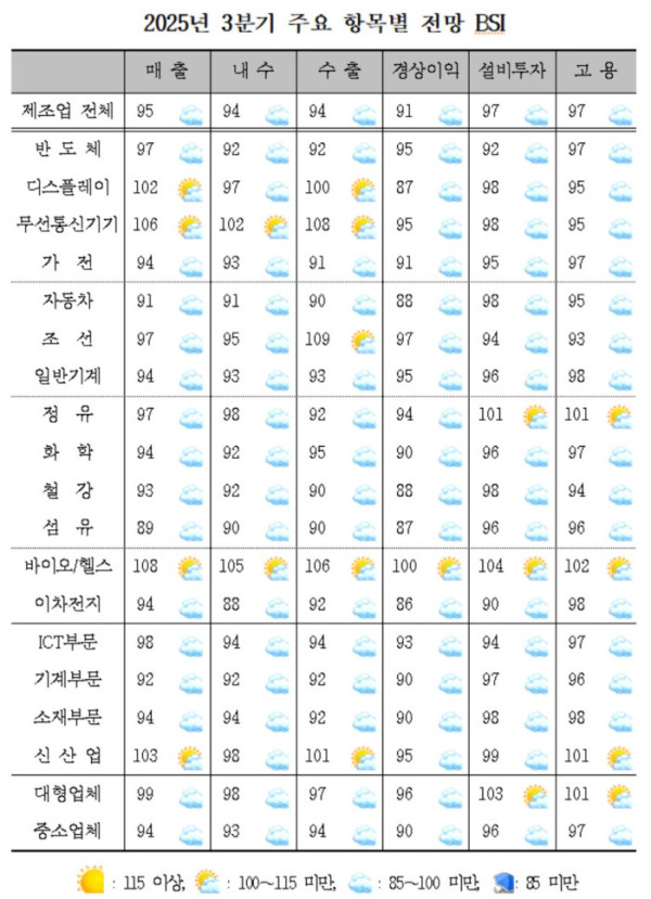 ▲2025년 3분기 주요 항목별 전망 ‘제조업 경기실사지수(BSI·Business Survey Index)’ (자료제공=산업연구원)