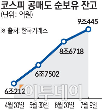 유가증권시장(코스피)의 공매도 순보유 잔고가 9조 원을 훌쩍 넘는 등 3월 말 공매도 거래 재개 이후 최고치로 치솟았다.