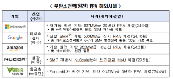 4대 에너지 다소비 산업(철강·석유화학·반도체·데이터센터)에서 RE100(재생에너지 100% 사용) 참여기업들의 평균 탄소 중립 목표연도인 2042년에도 21.4테라와트시(TWh) 상당의 무탄소전력이 부족할 것이라는 분석이 나왔다. 국내 기업들의 무탄소전력 초과수요 해소를 돕기 위해서는 전력구매계약(PPA) 제도 활성화를 최우선 과제로 삼아야 한다는 지적이 나온다.