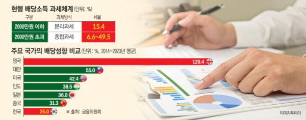 다만 대주주 등 고소득층에 대한 '부자 감세' 논란도 있는 만큼 무조건적인 감세보다는 배당성향이 일정 수준 이상인 기업을 대상으로 단계적인 세제 인센티브를 주는 방안도 논의 중인 것으로 알려졌다. 배당성향은 당기순이익 중 현금 지급된 배당금 총액 비율이다.